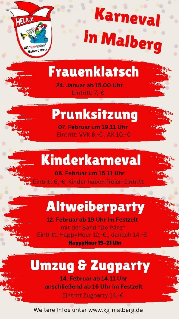 Der Vorverkauf findet am 4. Januar 2026 von 17:30 – 18:30 Uhr im Bürgerhaus Malberg statt!